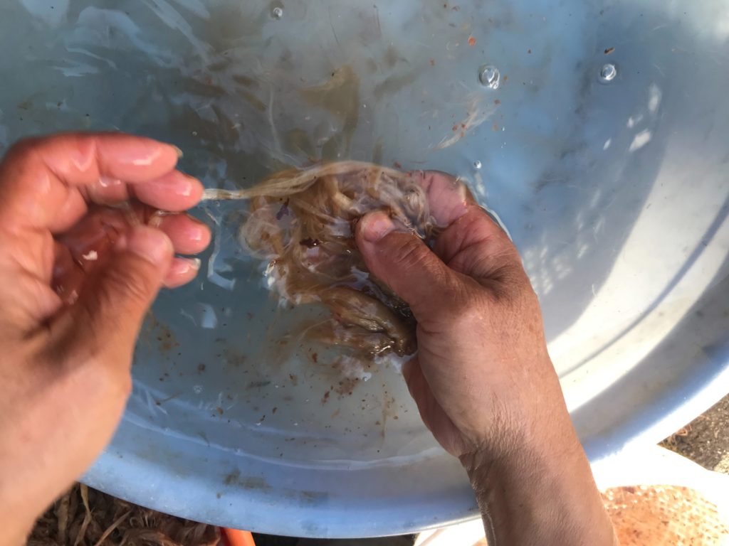 先生は通常、アク抜きのときや、叩解のときにチリを取られています。ですが、今回ばかりは多すぎるの違う方法でチリ取りを行いました。水の中に原料を入れ、その中でチリを取る方法です。美濃の和紙スクールでも同じような形でやらさせてもらいました。